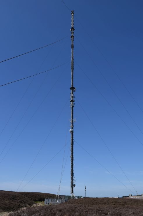 In January and May this year I visited the transmitter mast at Holme Moss, the site that serves our area and most of the north of England with FM and DAB radio. It stands on a summit 524m above sea level and is itself 228m high, broadcasting the national channels with 250kW. It was originally built to transmit the single BBC TV channel from 1951, which it did until the black-and-white 405 line service ended in 1985, at which point the old mast was demolished, a new one already in service on the same site. In 1956 it also became a radio site, transmitting VHF (FM) when that service first began. My feet got wet on the peaty moorland. Construction of the 140 ton lattice steel mast cannot have been easy.