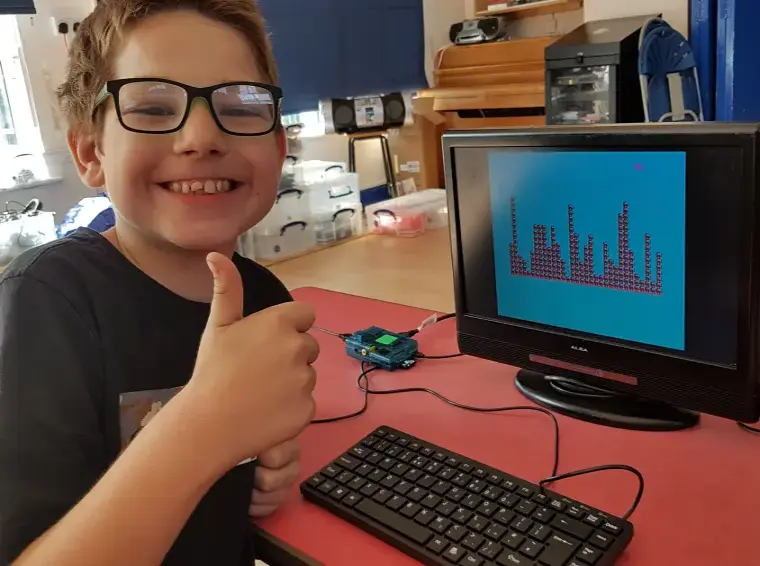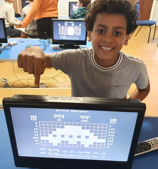To get the kid’s interest we started with a simple shoot ’em up game that needed to be completed. Soon they were designing sprites (moving characters) to make theirs unique, then choosing colours, which involved changing a few lines of code. Before long they were thinking of other things they wanted to alter, like adding a score or a ‘cheat’ mode where they get more ammo, and getting their hands dirty understanding how the program worked to make those changes. Further sessions taught basic programming concepts like loops and screen co-ordinates, and by the end they had coded up a program from scratch to move a character across the screen.