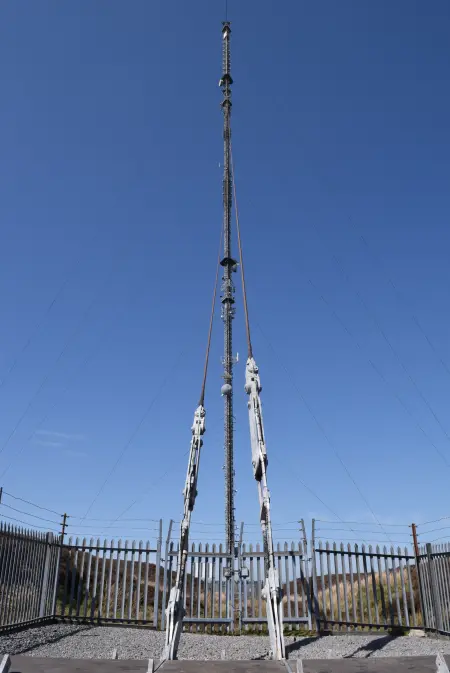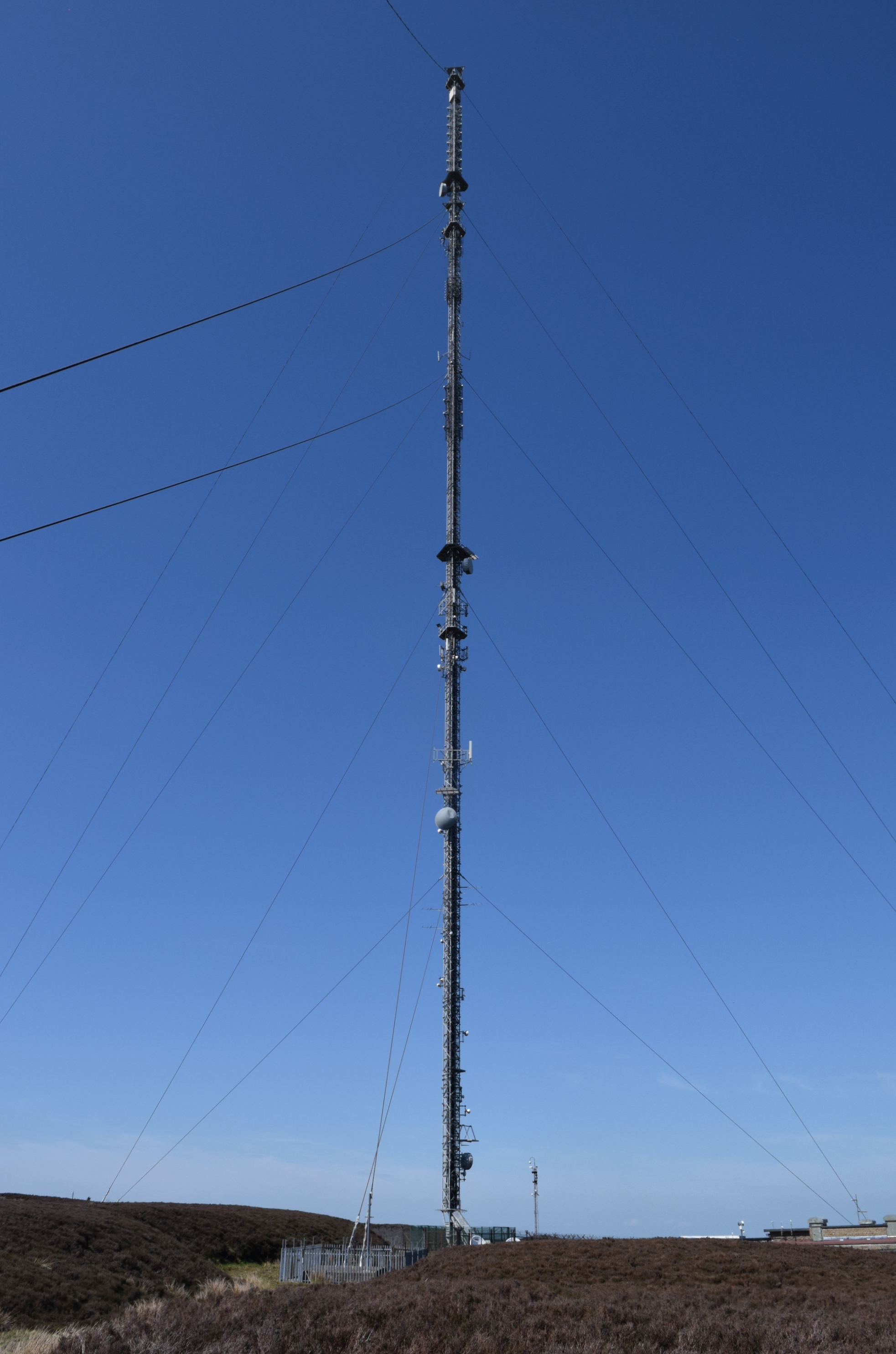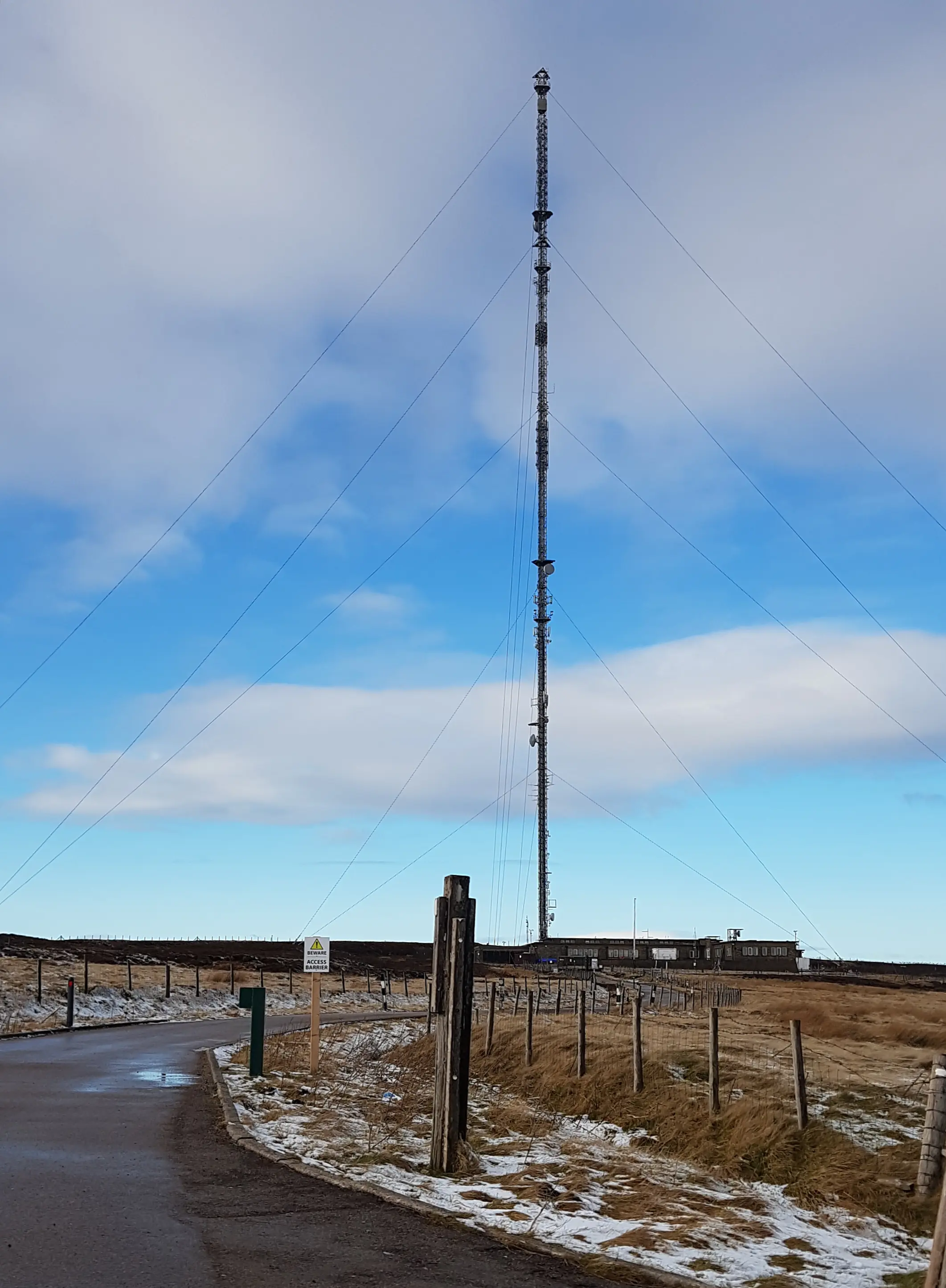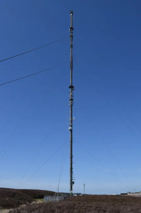 All pictures Copyright Click the pictures to see full size. 14 May 2022 The 228m mast broadcasts FM and DAB radio to the north of England. This mast was erected in 1983/84 and eventually replaced the 1951 mast when 405-line TV broadcasts ceased. The national FM stations radiate 250kW ERP. The spiky shape of the antennas gives mixed polarisation, so the broadcasts can be received equally well by horizontal aerials (e.g. on a house) and vertical (e.g. car aerials) or at a slant.