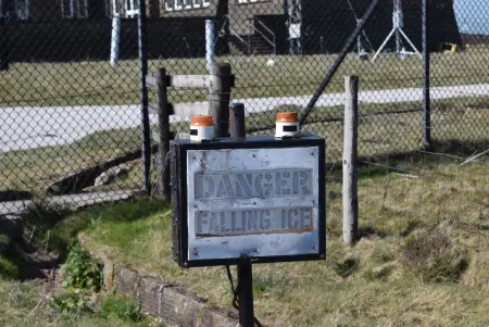 Falling ice sign. A very real danger in bad weather! Once, large lumps of ice made holes in the transmitter buildings roof.