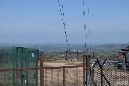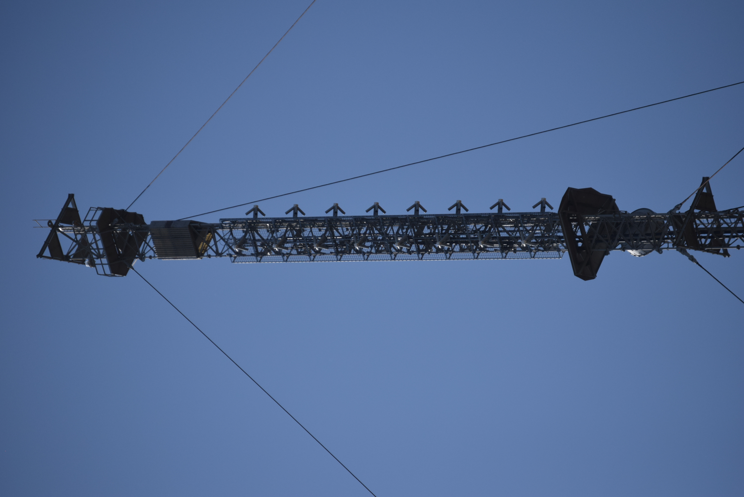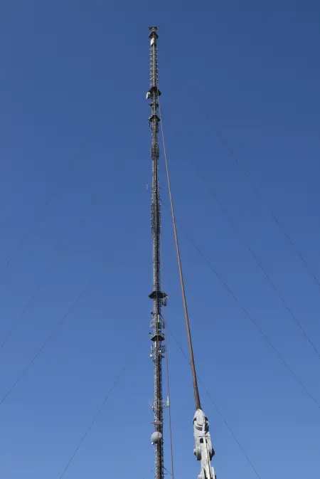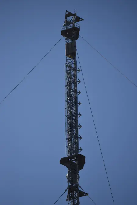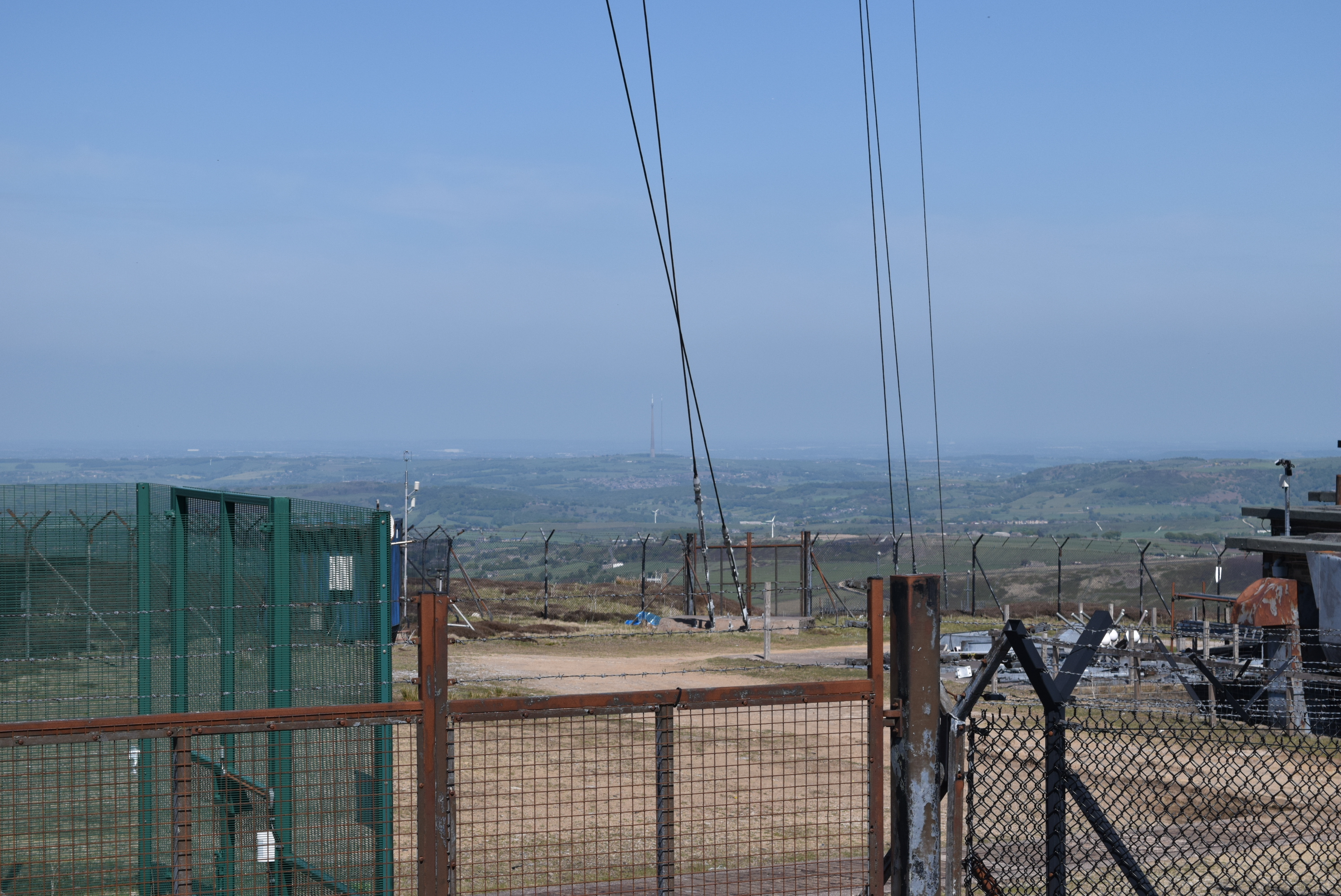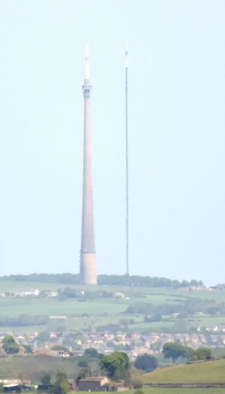 The grids on the opposite side of the mast prevent radiating in the wrong direction and interfering with other transmitters. Emley Moor can be seen in the distance The 330m concrete tower is joined by a temporary 317m lattice steel mast which was built to maintain service during the 700MHz clearance.